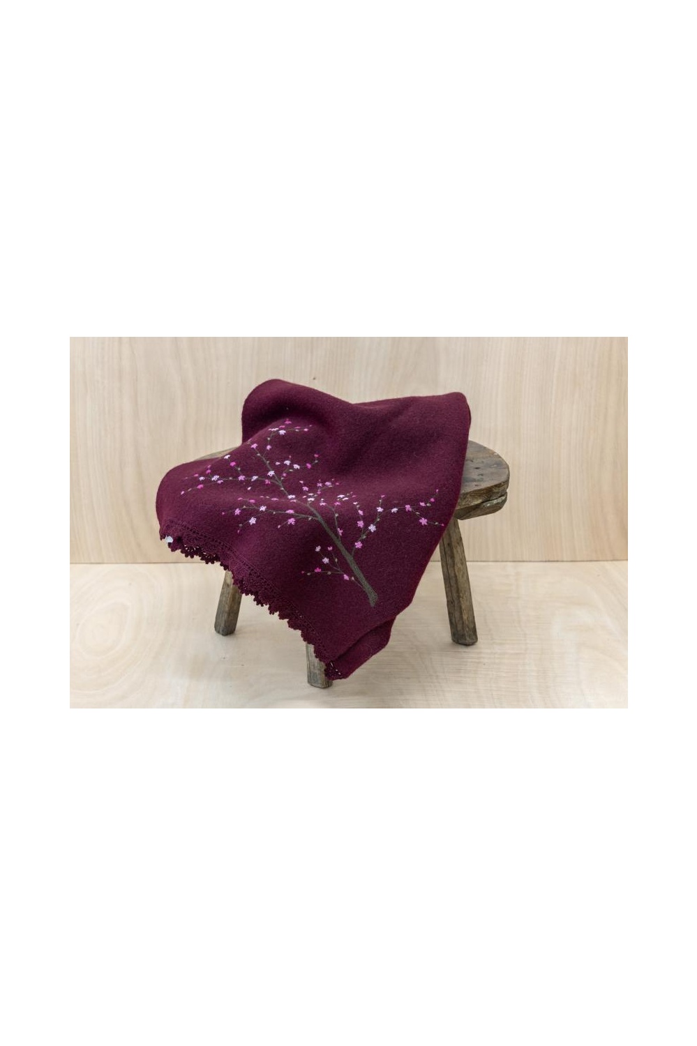Ploomipunane, samas toonis heegelpitsiga otstes, kaunistatud käsitsi tikitud lillede ja pärlitest lillesüdamikega.