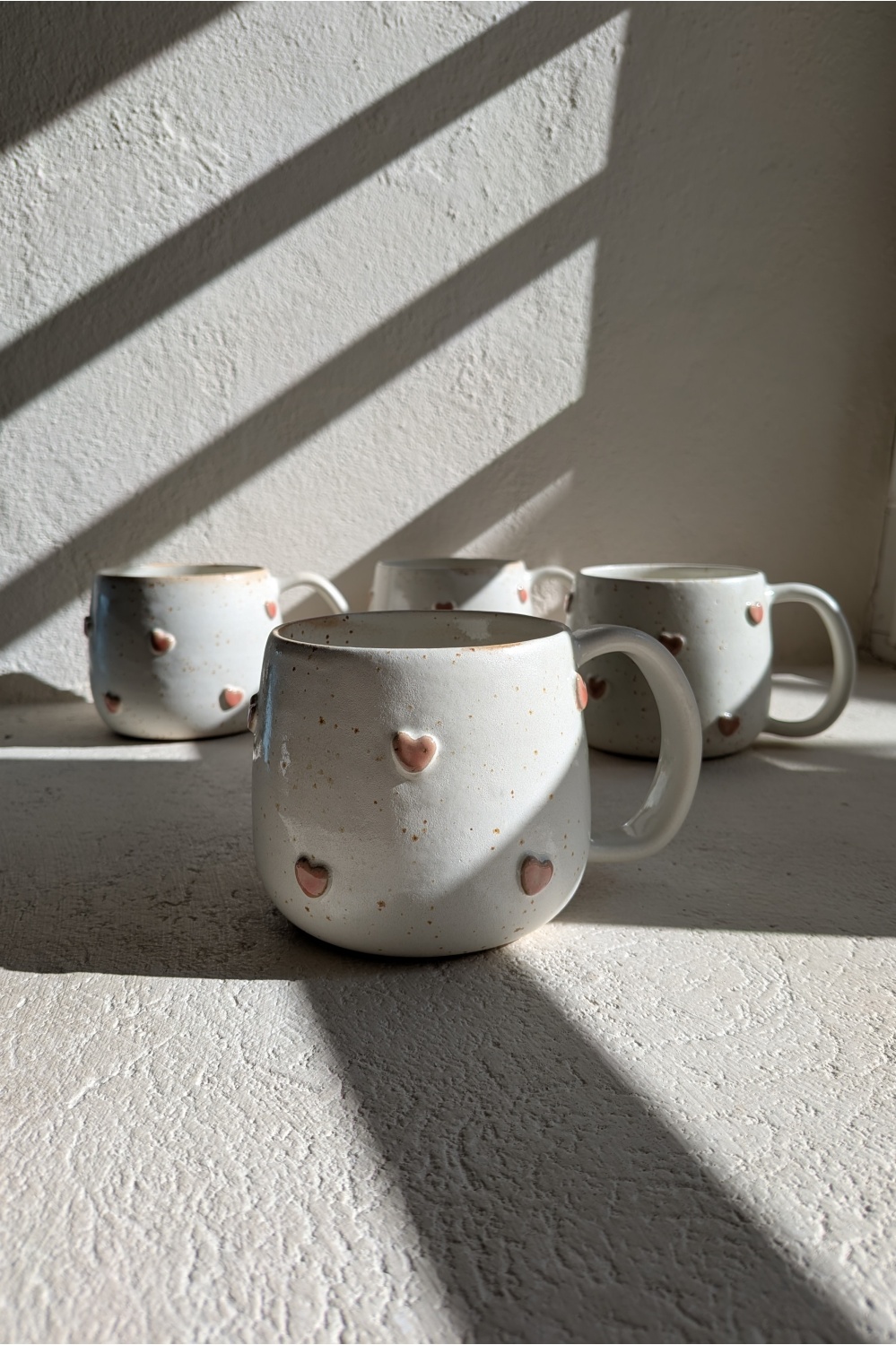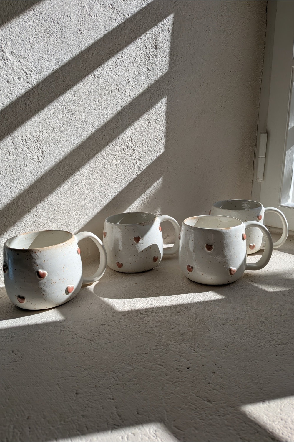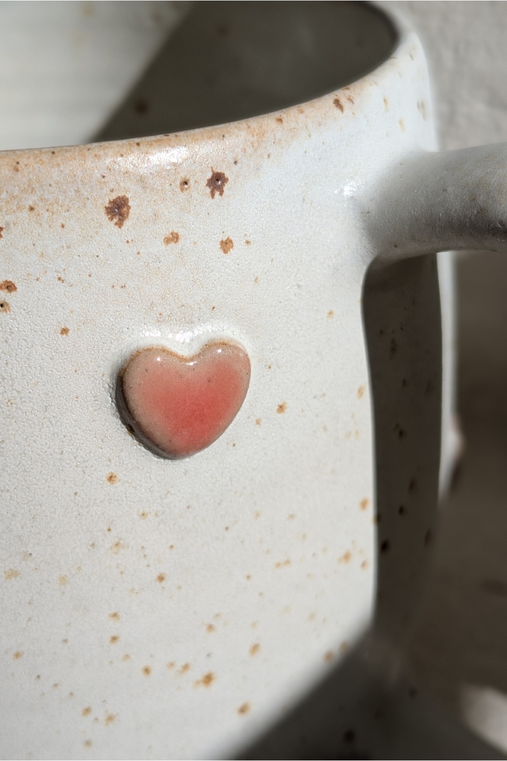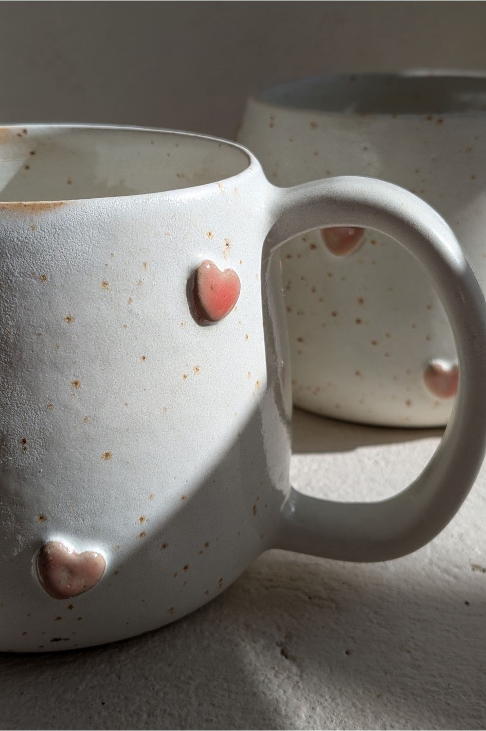 Mõnusalt mahukas ja sõbralikult kõhukas tass on glasuuritud kreemikasvalge siidmati glasuuriga, südamed talviselt lumeroosad.